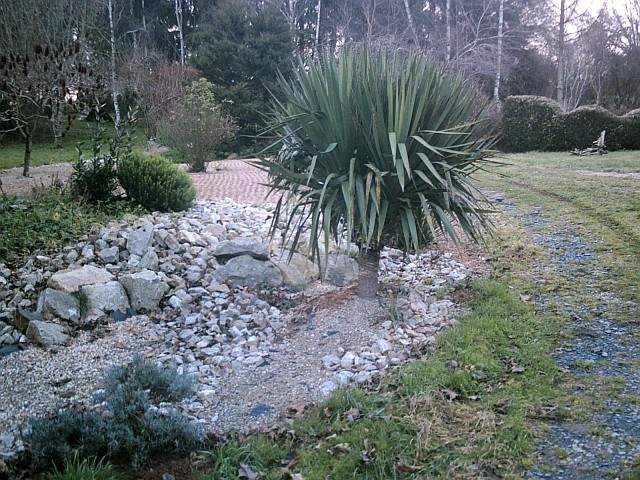 La rareté de l'eau devient une préoccupation. Priorité aux légumes qui ne peuvent s'en passer alors que certaines plantes d'ornement s'accomodent de la sécheresse. Ici, le Yuca est dans son élément avec l'Immortelle d'Italie, fétuc bleu,oeillet mignardise, etc...